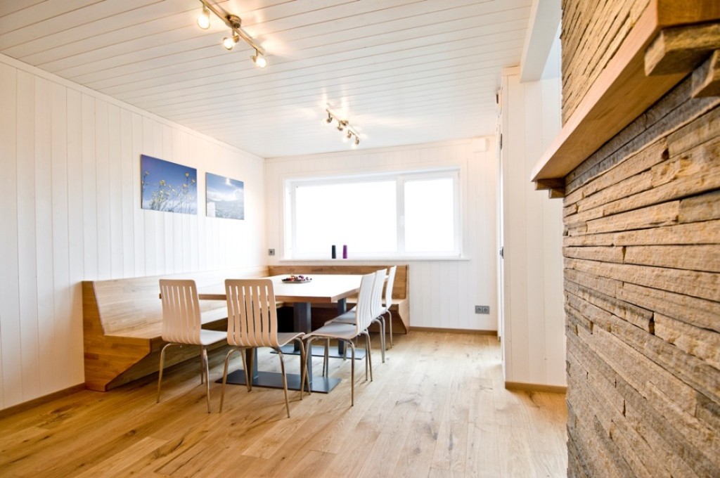 die Küche Es werden ursprünglich schmale PVC-Platten mit einer Holzstruktur verwendet, die wie eine Wandplatte aussehen. Solche Paneele verleihen dem Raum eine Atmosphäre von Komfort und Wärme. Und die Installation von Platten wird einfacher sein als bei der Installation von einem natürlichen Gegenstück. Oft werden Kunststoffplatten mit einer sichtbaren Naht hergestellt. Solche Platten können vorteilhaft in Innenräumen verwendet werden.