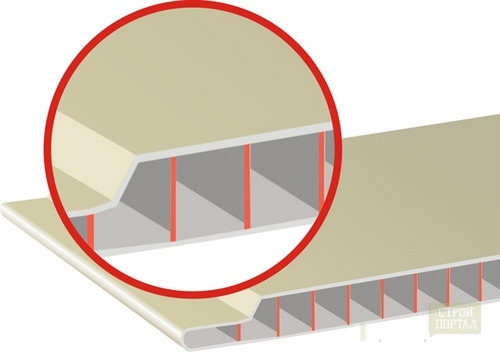 - Die Qualitätsversteifung an der Vorderseite der PVC-Platte scheint keineswegs durch. Beachten Sie, dass abhängig von der Anzahl der Kanten die Stärke des Panels abhängt. Je mehr von ihnen - desto länger die Lebensdauer des Panels.