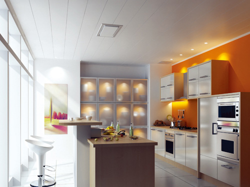 - Extrem einfaches und kostengünstiges Installationssystem aus Kunststoffplatten an der Decke.
