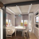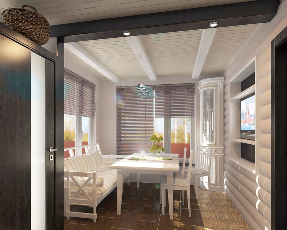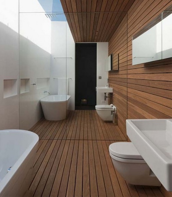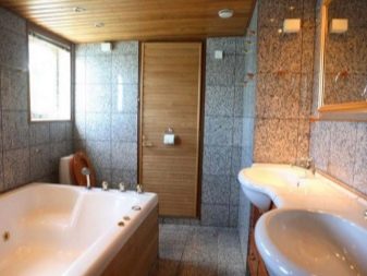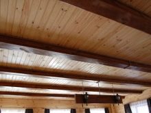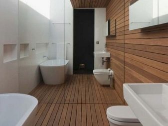 Was das Badezimmer anbelangt, so wird es für sein Design nicht als das beste Material angesehen, da es der hohen Luftfeuchtigkeit nicht standhält. Wenn im Inneren des Hauses Holz in allen Räumen verarbeitet wird, kann die Decke im Badezimmer aus kleinen Futtereinlagen bestehen, die zuvor mit einem Schutzlack überzogen wurden. Für dieses Zimmer passen Braun-, Beige- und Weißtöne der Paneele.
