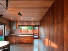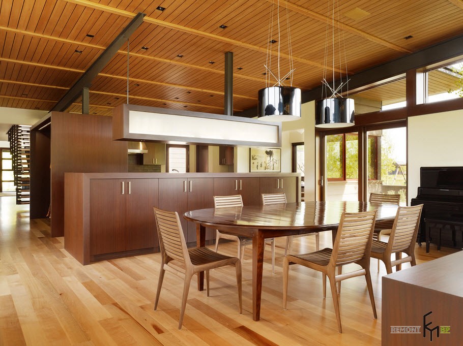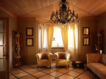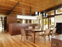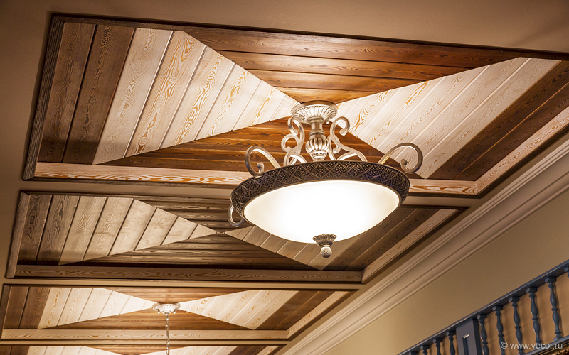 Es sollte nicht vergessen werden, dass Holztäfelungen eine richtige Auswahl der Farben erfordern - es muss eine vollkommene Harmonie im Inneren geben, Die Decke sollte kein separater Teil des Designs sein. Daher sollten Sie sehr auf seine Form, die Anzahl der Ebenen und die Komplexität des Designs achten. Zum Beispiel werden massive Designs von dunkler Farbe den Raum reduzieren und es dunkel machen, und helle Paneele Einsätze, im Gegenteil, werden die Grenzen erweitern.