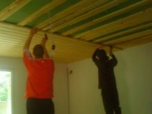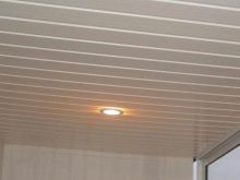 - Der nächste Schritt bei der Installation der Decke ist die Verlegung der Auskleidung. Zunächst auf die Rahmenschienen durch Einstellen ihrer Größe an die Wände kommen müssen, dann können Sie dekorative Bretter setzen. Alle Hintern Lücke bis zum Ende der Arbeit wird mit den Wänden geschlossen nashchelnikami und Gelenke werden - der Sockel. Wenn die Kunststoffauskleidung der Installation, im Gegenteil, in erster Linie festen Sockel, und erst dann die Platte gelegt.