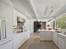Die Küche wird auch ein idealer Ort für hohe Decken sein. In diesem Raum können Sie Designs in beige, weiß und blau installieren. Gleichzeitig sehen Systeme, in denen jede Ebene ihre eigene Farbe hat, interessant aus. Wenn die Küche klein ist, kann ihre Decke in Form einer flachen Oberfläche einfach gemacht werden. Es ist wünschenswert, die Paneele mit glänzendem Lack zu überziehen - so wird der Raum mit Licht erfüllt und wird modern aussehen.
