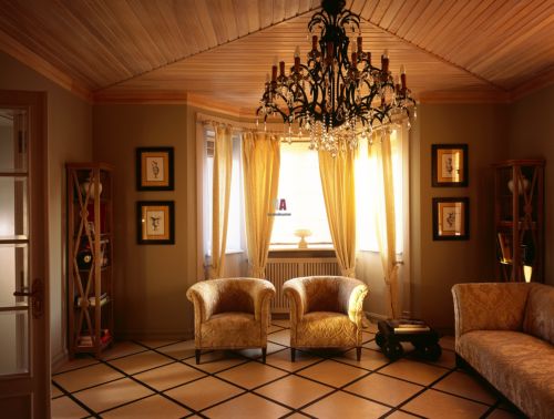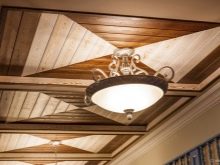 Um die Schönheit des Holzes weiter zu verbessern, sollten abgehängte Decken ein gutes Beleuchtungssystem in Form von stilvollen Kronleuchtern haben.
