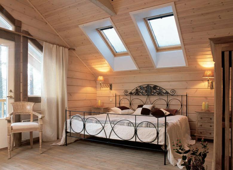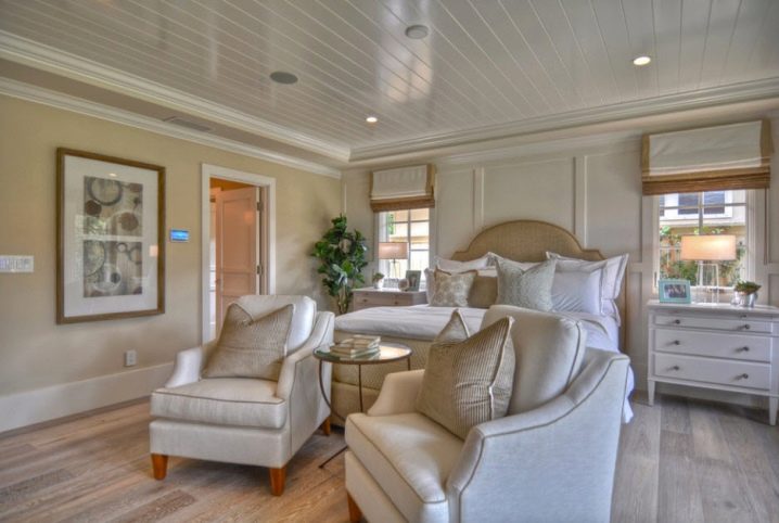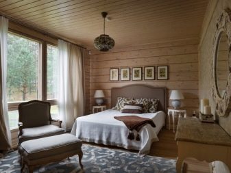 Stilvolle Möbel mit geschmiedeten Elementen, schönen Kronleuchtern und antiken Vasen ergänzen den Stil des Raumes. Darüber hinaus können die Bretter mit einem speziellen Fleck bedeckt werden - das Ergebnis wird ein mit Antiquitäten dekorierter Raum sein. Wenn die Eigentümer von Wohnungen oder Häusern eine romantische Atmosphäre im Schlafzimmer vorziehen, dann ist es am besten, leichte Farbtöne des Futters zu wählen, um die Decken zu beenden. Sie werden gut mit Wanddekoration, Textilien und Möbeln kombiniert.