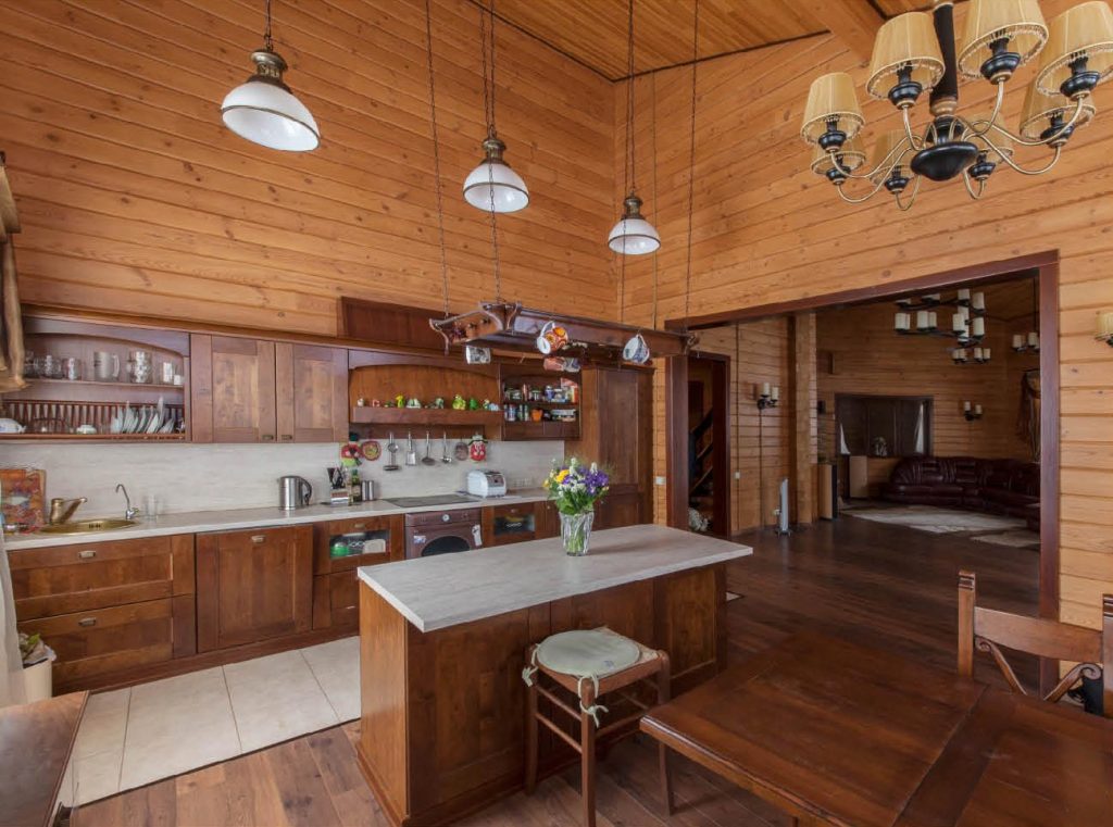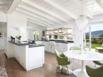 Die Küche wird oft auch als Deckenverkleidung mit Kunststoffschindel verwendet, da sie idealerweise nicht nur Holz, sondern auch Naturstein imitiert. Damit der Innenraum ein vollständiges Bild erhält, können die abgehängten Strukturen mit dekorativen Elementen aus Glas und Metall ergänzt werden. Zum Beispiel hängen Sie geschmiedete Kronleuchter und platzieren Sie einen Tisch mit einer Glasplatte. Zur gleichen Zeit ist es wünschenswert, Möbelstücke aus teuren Hölzern zu wählen - dieser Ansatz wird dem Raum Chic geben.