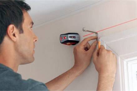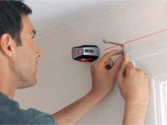 - Bestimmt die Richtung der Montageverkleidung. Wenn es longitudinal ist, ist die Drehung des Rahmens über quer mit der quer - umgekehrt. Außerdem müssen Sie vor der Installation die Höhe der zukünftigen Decke festlegen und die Markierungen zeichnen, die archiviert werden. Der Rahmen muss 5-10 cm unter der Hauptdecke montiert werden. Um dies alles richtig zu machen, empfiehlt es sich, einen Laser oder eine hydraulische Ebene zu verwenden.