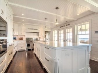 Auf dem modernen Markt gibt es viele Modelle von Wandverkleidungen, so dass Sie jede Designidee in die Realität umsetzen können. Die weiße Decke eines Holzes gilt als wunderbare Dekoration für den Raum, da sie nicht nur die Raumgrenzen optisch erweitert, sondern auch den Raum hell macht,füllen Sie es mit einer besonderen Atmosphäre des Komforts. Wenn gewünscht, kann die abgehängte Struktur mit farbigen Abschnitten ergänzt werden oder Einsätze aus dunklen Platten machen.