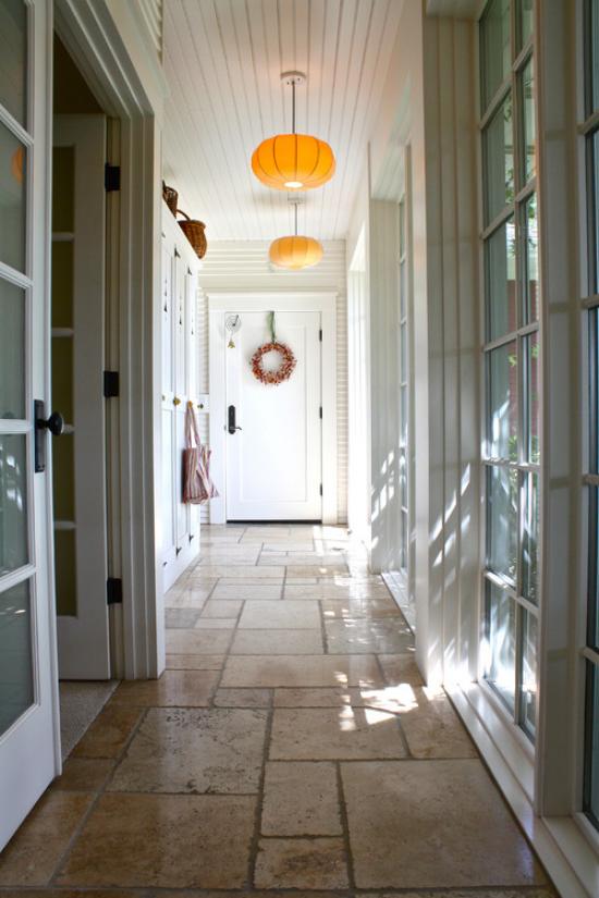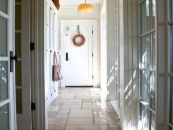 Holzdecken wirken wie eine Kellerei vor dem Hintergrund von Mauerwerk, so dass in den Fluren empfohlen wird, Keramikfliesen unter den Granit zu legen oder kleine Einbauten von Dekorationsmaterial an den Wänden anzubringen.