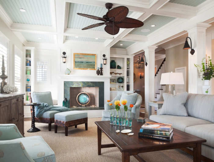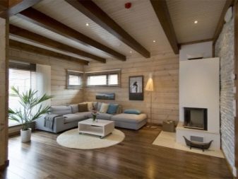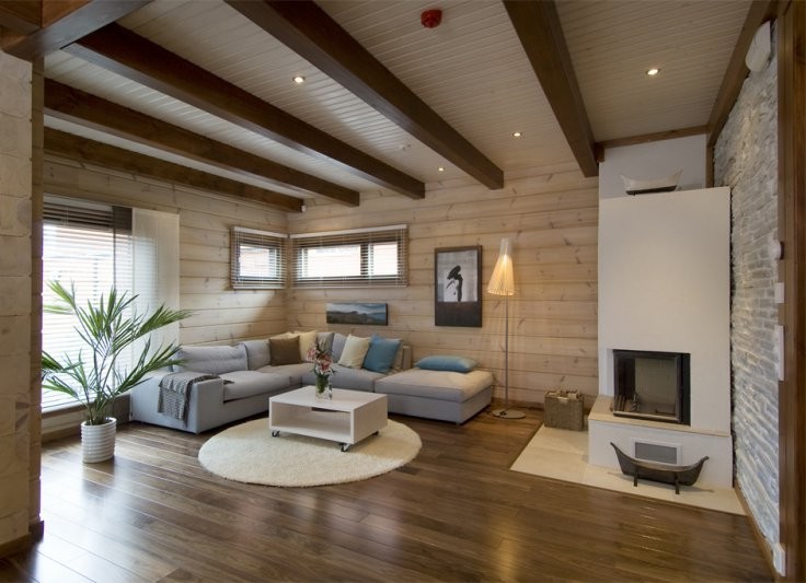 Wenn es die Größe des Wohnzimmers zulässt, können Sie auch eine Decke erstellen, die wie ein Balken aussieht. In der Regel wird diese Gestaltungsidee bei der Gestaltung von Räumen im alpinen Stil verwendet.