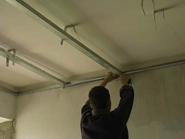 - Nach allen Markierungen müssen Sie das Führungsprofil aus Aluminium um den Raum herum befestigen. Andockteile können mit Schrauben und Dübeln verwendet werden. In diesem Fall muss das Profil den Abmessungen der Struktur entsprechen, daher wird es geschnitten und entlang der Länge und Breite des Gerüsts platziert.Um Karkasse Festigkeit zu erhöhen, ist es ferner Suspensionen verstärken, Schritt 60 cm beobachtet.