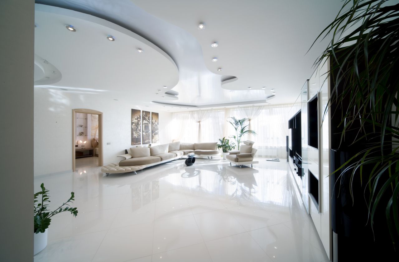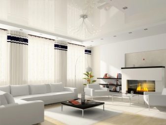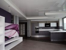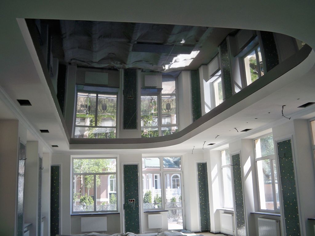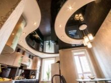 Wenn Sie ein glänzendes Material mit einem Spiegeleffekt auftragen, wird der Platz optisch erweitert. Solche Decken können in allen Wohnräumen installiert werden..