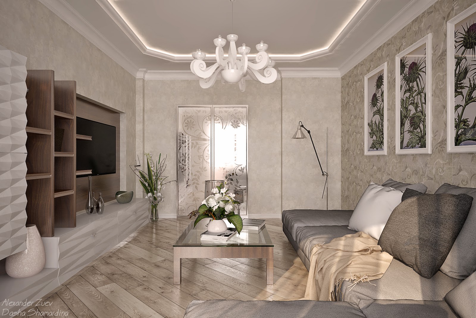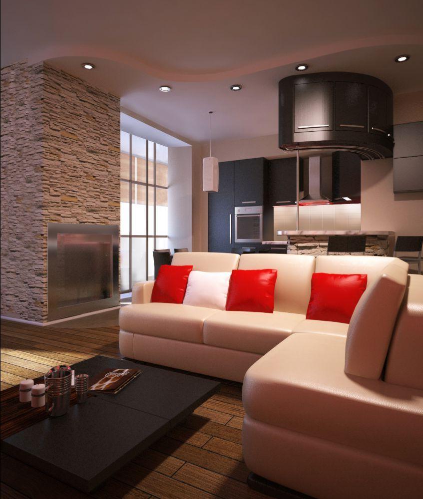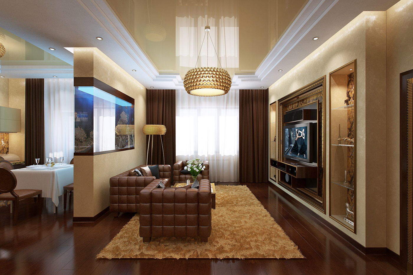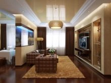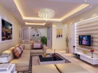 Klappbare Strukturen, die aus mehreren Etagen bestehen, sind für alle Räume gut geeignet, aber sie sind besonders schick in den Wohnzimmern. Um ein stilvolles Interieur in diesem Raum zu entwerfen, ist es am besten, Decken mit glänzenden Beigetönen zu wählen. Es wird empfohlen, einen Kronleuchter in der Mitte des Rahmens zu installieren und den Umfang mit LED-Beleuchtung zu dekorieren. Optisch lässt sich das Zoning im Wohnzimmer mit Hilfe von Farbeinsätzen vornehmen, dafür eignet sich eine Kombination aus Rot und Schwarz.