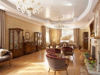 Wenn die Hausbesitzer den klassischen Stil bevorzugen, dann wählen sie für das Wohnzimmer mehrstufige Strukturen mit weißer und schwarzer Farbe. Um die Atmosphäre des Raumes mit Noten des Ostens zu verdünnen, ist es am besten, die erste Ebene der Konstruktion mit großen Sakura-Zeichnungen zu dekorieren, und am zweiten Platz stilvolle hölzerne Kronleuchter.