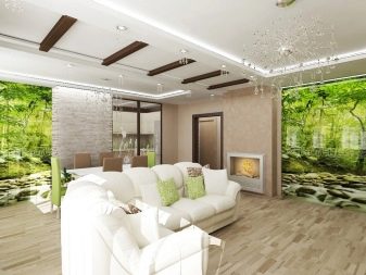 Wenn die Hauseigentümer dem Raum Kreativität geben wollen, ist es empfehlenswert, die obere Struktur der Decke der Vinylfolie zu machen. Gleichzeitig wird die Raum-, Spot- und Zentralbeleuchtung den Raum hell beleuchten und einzelne Elemente des Interieurs besonders gut zur Geltung bringen.