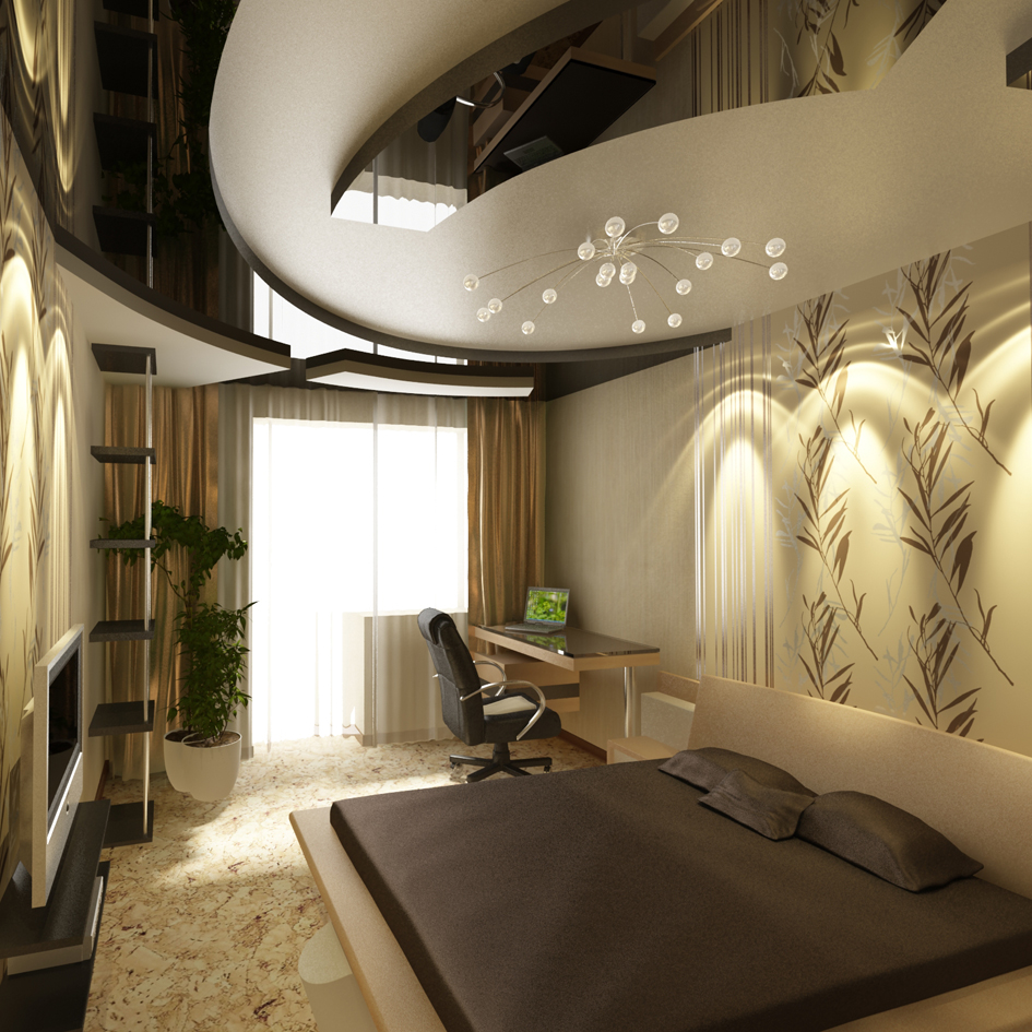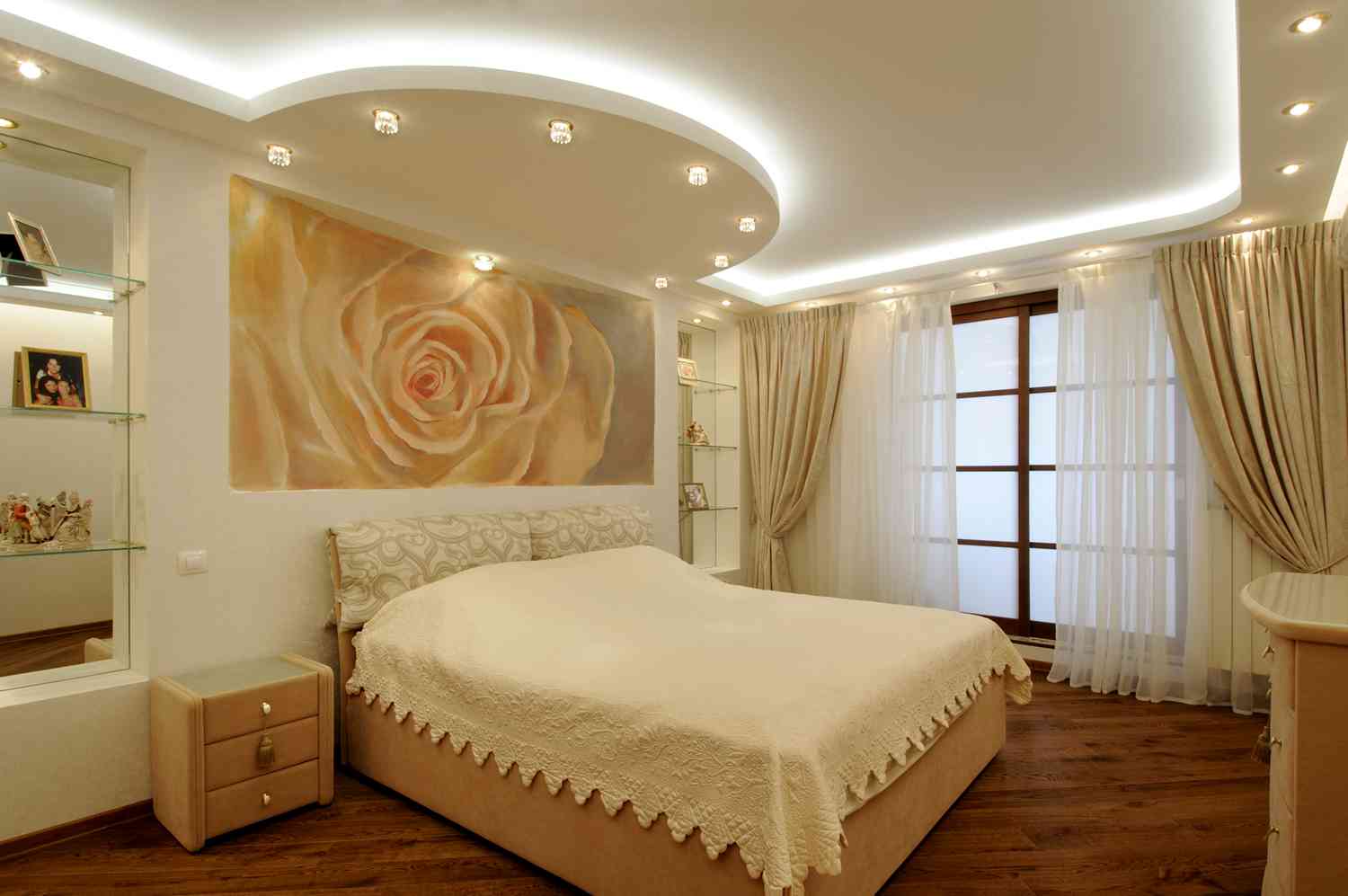 Was das Schlafzimmer betrifft, dann müssen Sie ins Innere dieses Zimmers besondere Aufmerksamkeit lenken. Wände, Bodenbelag und Deckengestaltung sollten in neutralen Farbtönen und so viel wie möglich zu einer angenehmen Ruhe erfolgen. Daher setzen die Schlafzimmer in den Schlafzimmern meist mehrstufige Decken mit mattierten Stoffen ein, auf denen Sie persönliche Fotos, Zeichnungen und verschiedene Muster darstellen können.