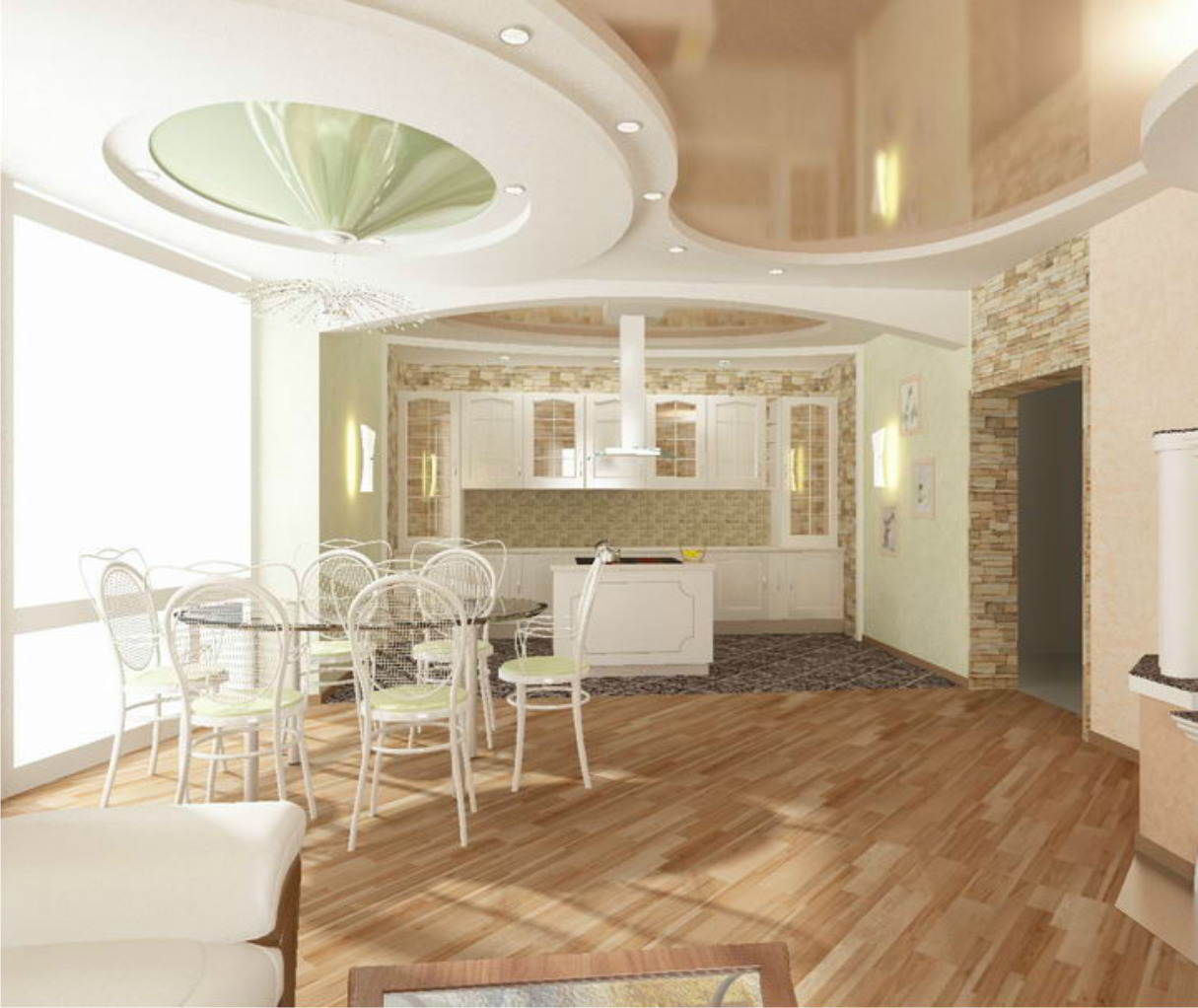 Darüber hinaus bieten Multi-Level-Decken große Möglichkeiten für die Umsetzung der ungewöhnlichsten Design-Ideen, da das Material in der Installation von Systemen eine schicke Auswahl an Texturen und Farben verwendet. Die Installation von Strukturen ist einfach, so dass Sie es selbst tun können.