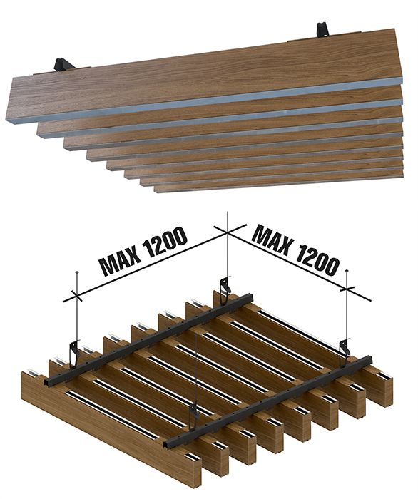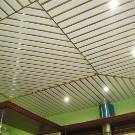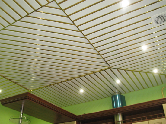 Die Stile der Schienen sind vielfältig, darunter sind Deutsch und Italienisch. Die erste wird in Form von rechteckigen perforierten Wagen hergestellt. Bei der Installation wird eine versteckte Methode verwendet und die Oberfläche der Decke wird flach und glatt. Im zweiten Fall ist es zulässig, Stahl- oder Aluminiumlamellen mit einer Gitterstruktur und einem hohen Profil mit leicht abgerundeten Kanten herzustellen.In diesem Fall erlauben wir sowohl die versteckte als auch die offene Installationsmethode. Im zweiten Fall sind die Fugen zwischen den Paneelen mit dekorativen Elementen maskiert.