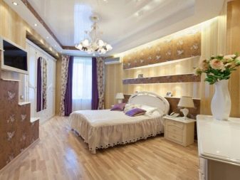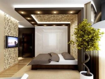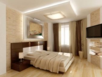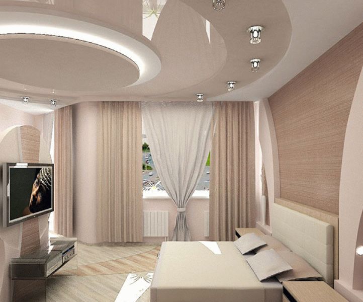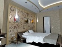 Decken können zwei-, drei- oder viergeschossig sein, je nach Wunsch und Schlafzimmerbereich. Mit dem richtigen Design können Sie den Raum optisch vergrößern, und eine Vielzahl von eingebauten Lampen und Kronleuchtern für Gipskartondecken verleihen dem Schlafzimmer eine gute Beleuchtung und Exklusivität. Ein weiterer Vorteil dieser Art ist der relativ niedrige Preis für Materialien und Komponenten.