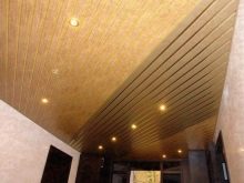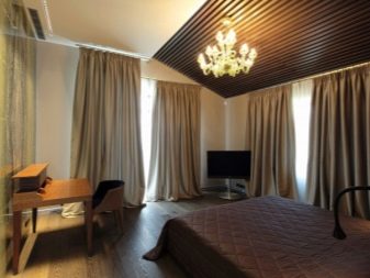 Die abgehängte Decke dieser Art wird selten für das Schlafzimmer gewählt, aber manchmal bestehen die Eigentümer auf dieser Art der Konstruktion wegen seiner Vielseitigkeit und des erschwinglichen Preises. Die Grundlage für solche Decken sind in der Regel Aluminiumlamellen, für Wohnräume jedoch PVC. Solche Lamellen werden Schindelplatten genannt, ihre Standardlänge beträgt drei Meter. Der moderne Markt bietet eine breite Palette von Paneelen mit einem interessanten Design. Ihre Beschichtung kann metallischen Glanz imitieren, sei es Gold, Silber oder Bronze. Natürlich gibt es andere Farben.