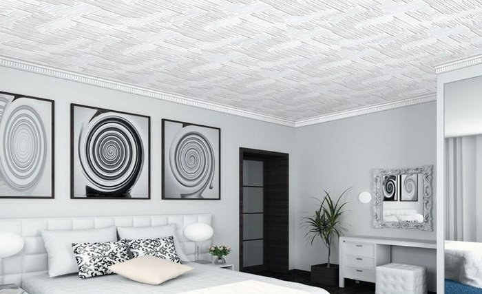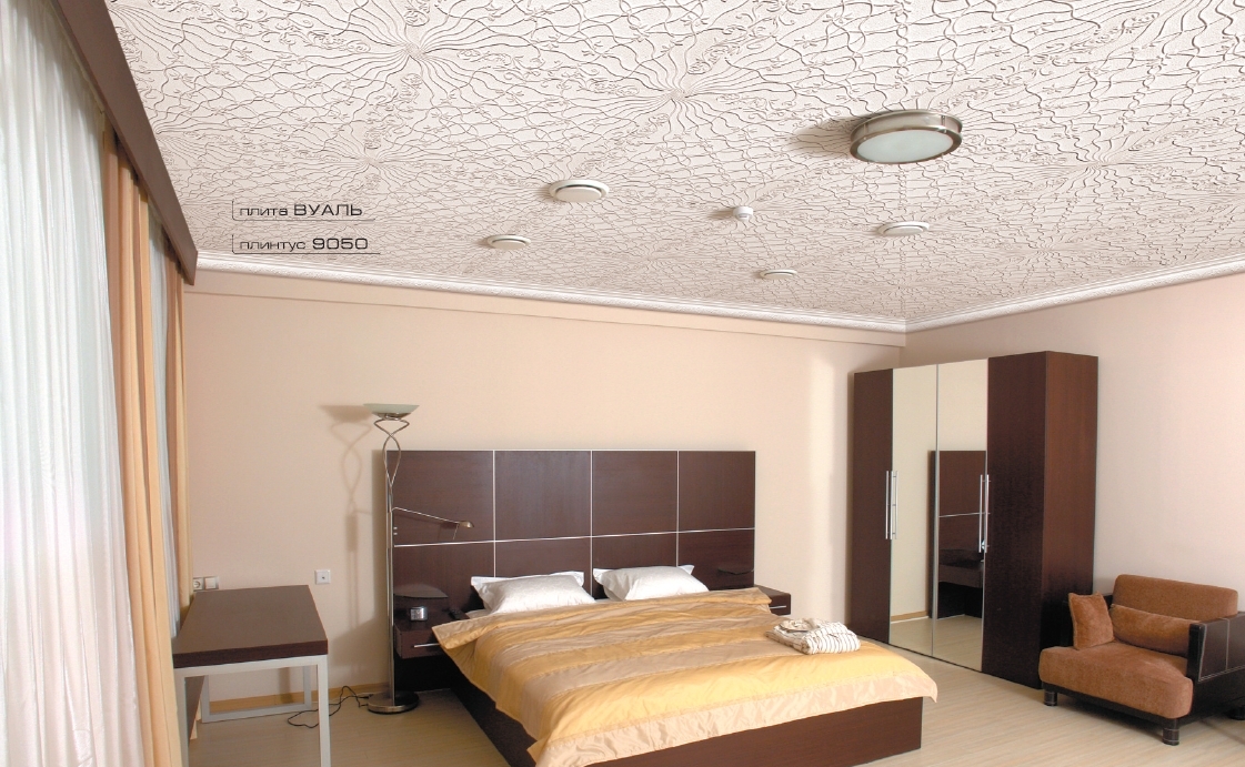 Eine andere Art von abgehängten Decken für das Schlafzimmer ist Leim. Seine Besonderheit liegt in speziellen Paneelen, die an die Decke geklebt werden. Diese Methode ist recht einfach und bezieht sich auf den Budgettyp. Die Oberteile bestehen aus Schaumstoff oder Polystyrol, sie sind mit einer speziellen Zusammensetzung an die Decke geklebt. Deckenpaneele sind in mehrere Typen unterteilt, die nach der Art der Herstellung klassifiziert werden: