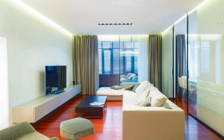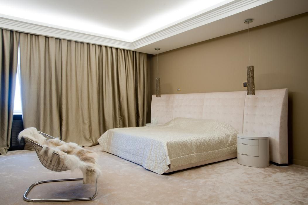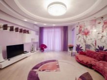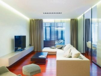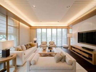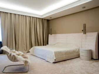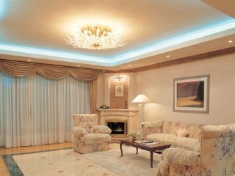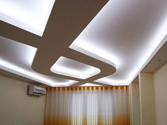 Jetzt beliebte Methode der Fertigstellung: abgehängte Decken mit versteckten Vorhängen und versteckte Beleuchtung, die in einer Nische zusammen mit der Traufe montiert ist.Das ursprüngliche Design wird in jedem Raum angebracht sein und wird die Besitzer nicht stören. In diesem Fall als Beleuchtungsvorrichtung, der einfachste Weg, um einen LED-Streifen zu installieren.