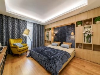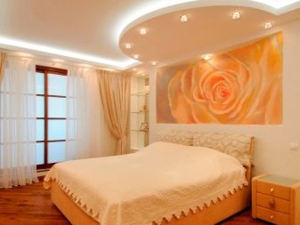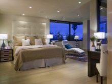 Eine weitere ausgezeichnete Option ist eine Trockenbau-Box, die ein bogenförmiges Bett umrahmt. Mehrere Scheinwerfer sind darin eingebaut. Es ist sowohl schön als auch praktisch. Wenn Sie Kleidung wechseln, etwas holen oder einfach nachts aufstehen müssen, ist es nicht nötig, das Hauptlicht einzuschalten.