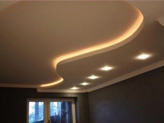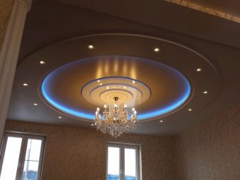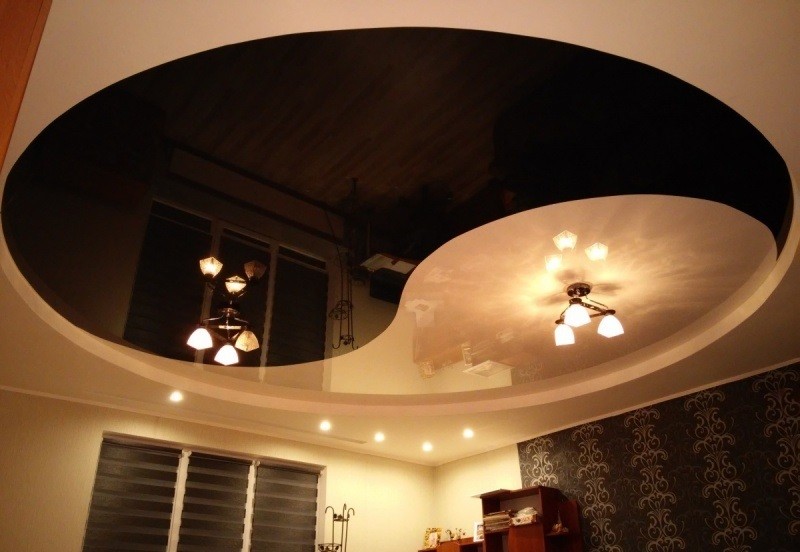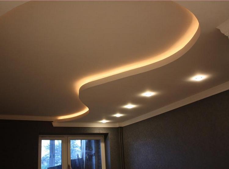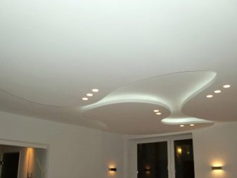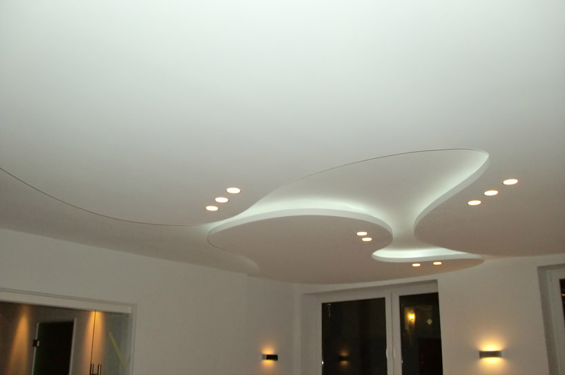 - Der häufigste Typ ist Gipskartondecke. Die Platten sind auf Rahmenführungen montiert, die für eine lange Lebensdauer und Zuverlässigkeit aus verzinktem Metall bestehen. Durch die Verwendung von dünnen Metallprofilen können Sie ihnen alle Biegungen und Formen geben. Die Decke kann einstöckig, doppelt, dreifach und mehr sein, wenn die Höhe dies zulässt. Gipskarton-Finish erfordert ein Finish.Mit Hilfe von Farbe können sie jede Farbe und Textur (glänzend oder matt Glanz, spielen) gegeben werden. Im feuchten Zustand kann Gipskarton gebogen werden, und nach dem Trocknen erhält es die gewünschte Form. So sind verschiedene Kurven, Wellen und andere Elemente ausgestattet.