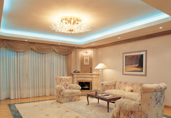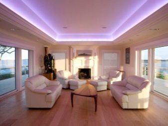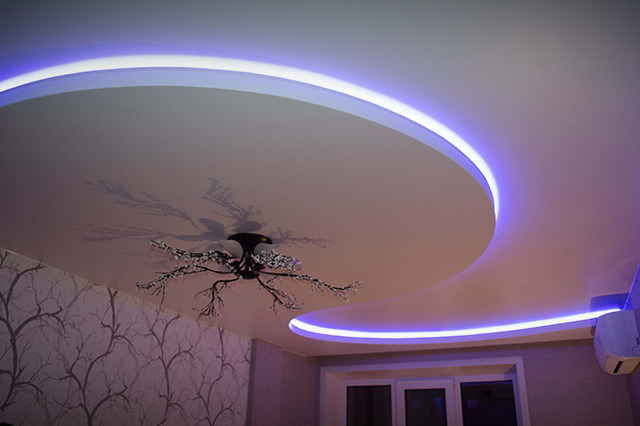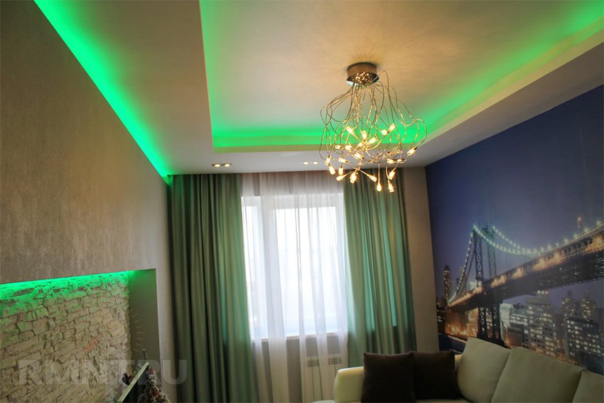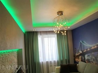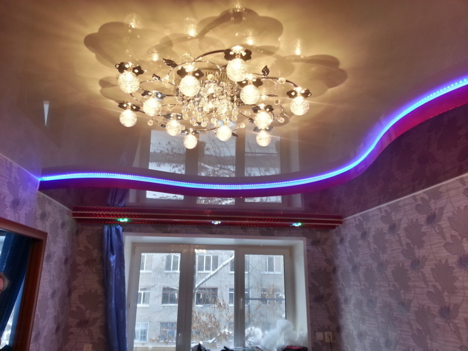 Innenbeleuchtung kann Kontur oder in Zonen eingeteilt werden. Konturierte Bänder mit weichem Licht eignen sich für Wohn- und Schlafzimmer. Wenn Sie Angst haben, die Lampen selbst zu nehmen, sind vorgefertigte LED-Streifen auf dem Markt. Es gibt sogar Optionen für ein Kinderzimmer.