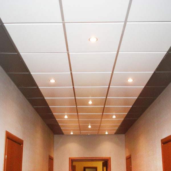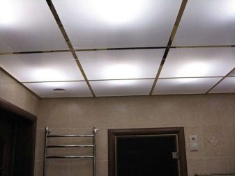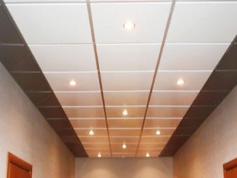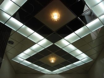 - Kassettendecke. Solche Decken werden auf der Grundlage des Rahmens hergestellt, auf dem rechteckige oder quadratische Kassetten installiert sind. Sie sind aus Aluminium oder verzinktem Metall, sowie mit Spiegeloberflächen. Die Einrichtung erfolgt auf Kosten mehrerer Entlastungsmöglichkeiten für das Design und Färben in jeder Farbe.