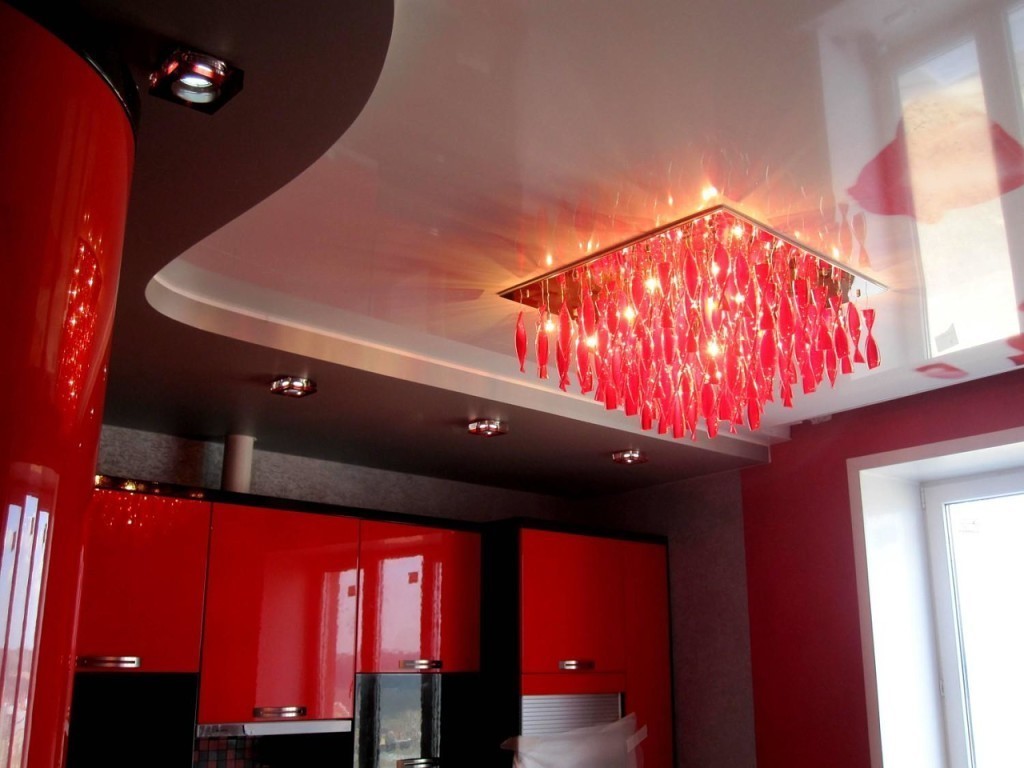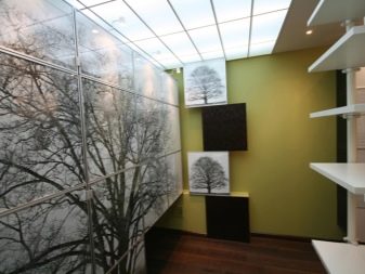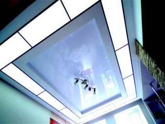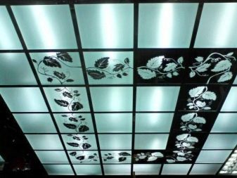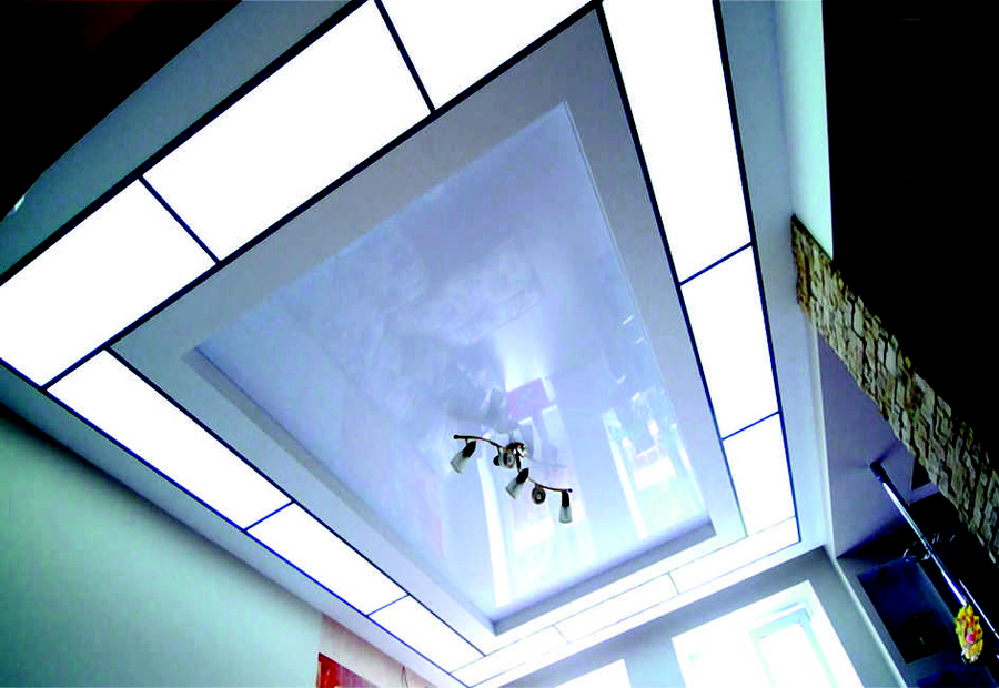 - Acryldecken. Plexiglasplatten werden als Hängeelemente verwendet. Sie sind auf Metallschienen montiert. Mit Hilfe der modernen Technologie können Sie beliebige Muster, Texturen und Farben von Glasscheiben erstellen.
