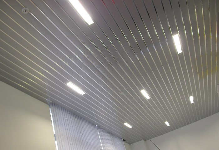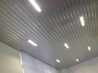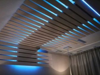 - Rack-Decke. Besteht aus einzelnen Latten aus verzinkten Materialien, Aluminium oder Kunststoff. Die Strukturelemente haben eine geringe Dicke von nicht mehr als 0,5 mm und sind an der Metallbasis befestigt. Der Vorteil dieser Art von Decke ist ihre Haltbarkeit und Verschleißfestigkeit. Die Beschichtung wird nicht durch Feuchtigkeit, Temperaturänderungen, Frost verformt, ist feuerbeständig. Das Farbschema ist sehr vielfältig.