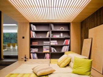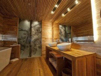 - Holzdecke kann als Unterart des Racks identifiziert werden. Holzbretter haben ihre Vorteile gegenüber Metall und Kunststoff. Der größte Vorteil ist die Umweltfreundlichkeit des natürlichen Materials, die Fähigkeit, Luft, Dampf und Feuchtigkeit zu passieren. Für solche Beschichtungen ist der moderne Trend Eco-Style am besten geeignet.