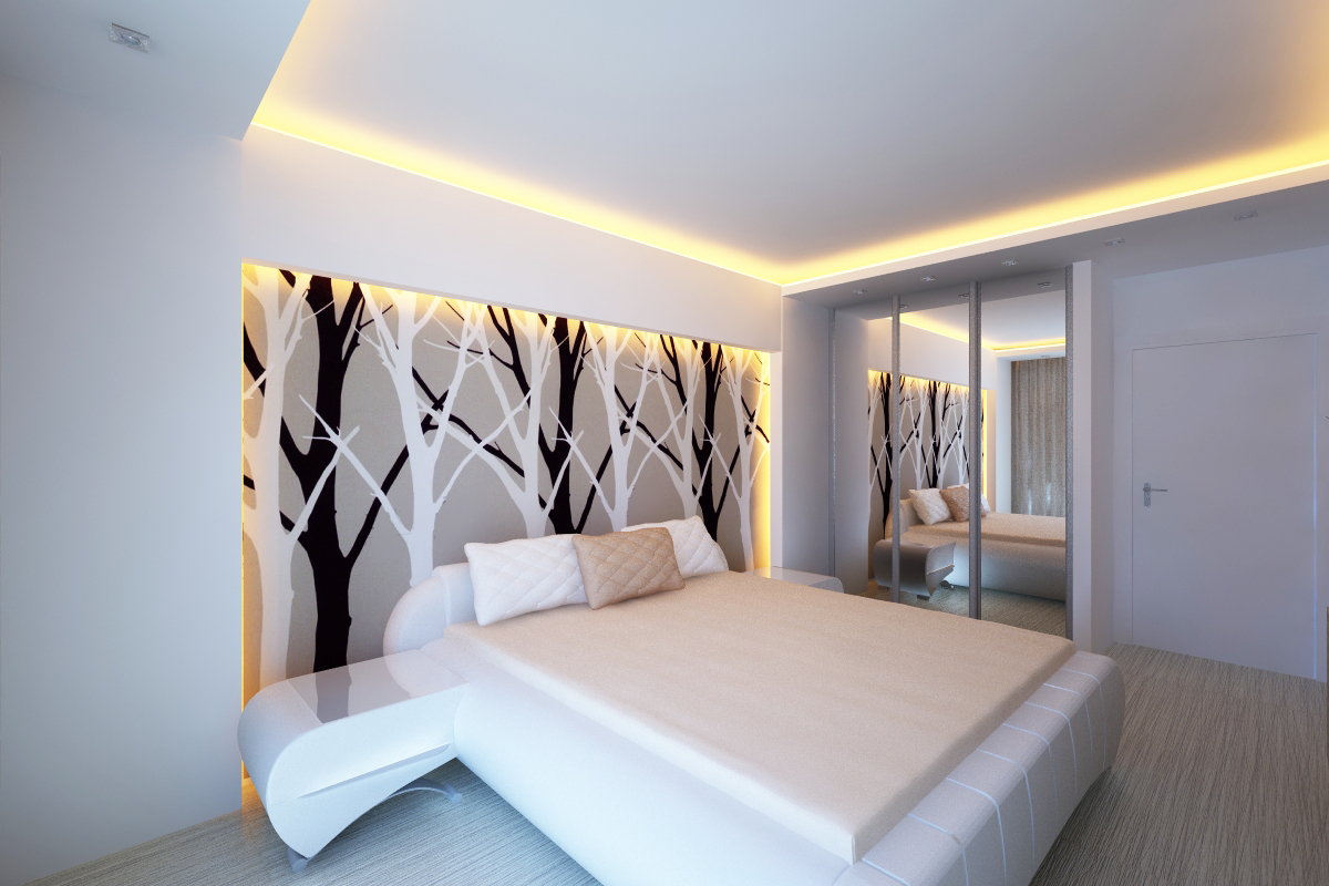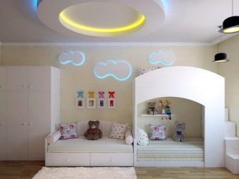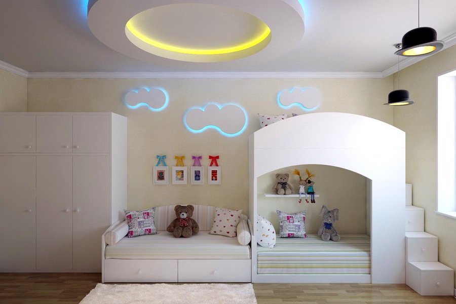 Im Schlafzimmer können Sie eine Nische an der Decke machen und sie mit einer versteckten Beleuchtung dekorieren oder umgekehrt. Kinderzimmer sind ein besonderer Raum für Fantasie. Mit versteckten Scheinwerfern können Sie den Effekt des Sternenhimmels arrangieren, schöne Zeichnungen mit Acryleinlagen wählen, die gespannte Leinwand mit einem fröhlichen Muster mit der bunten Konturenbeleuchtung betonen.