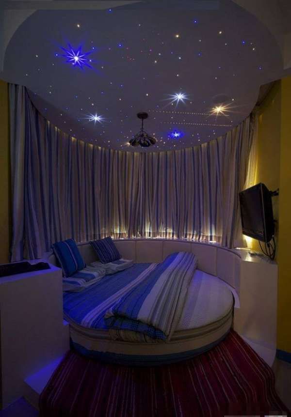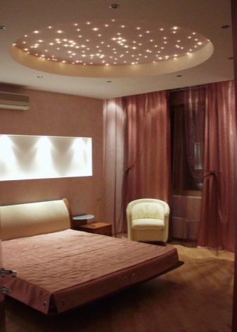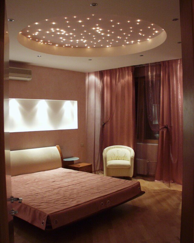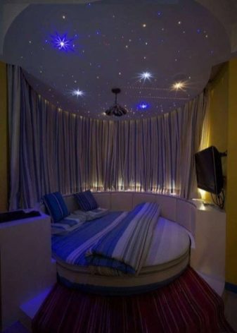 Das Schlafzimmer wird im Bettbereich gut aussehen, akzentuiert durch eine runde Nische mit Nachahmung des Sternenhimmels. Am Abend gibt eine solche Beleuchtung eine romantische Stimmung und Ruhe.
