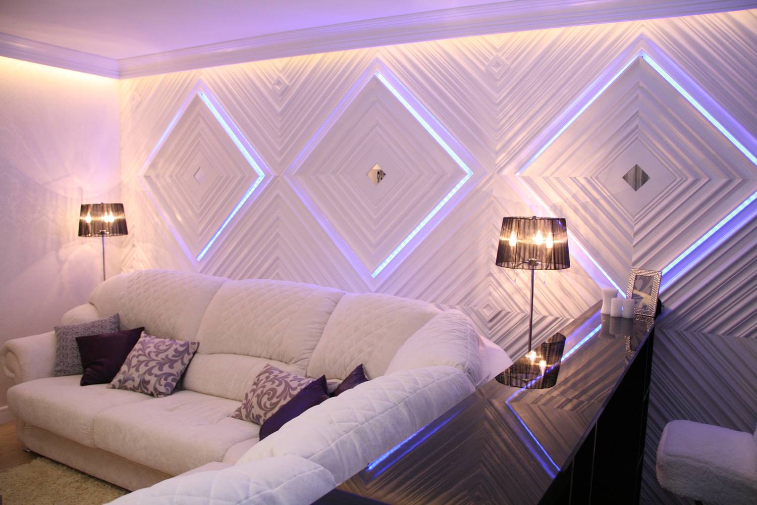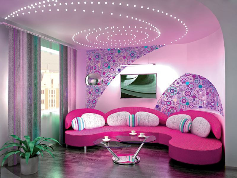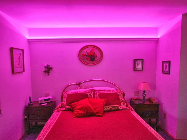 Farbbeleuchtung ist nicht jedermanns Sache. Blaue und rote Schattierungen können Aggressionen und Beschwerden verursachen. Sie können einen blauen Farbton für die Einrichtung von Arbeitsbereichen wählen - Sie werden sich konzentrieren und Ruhe bringen. Gelb- und Orangetöne geben Komfort und Wärme. Rosa und lila Gamma werden Romantik und Glamour hinzufügen.