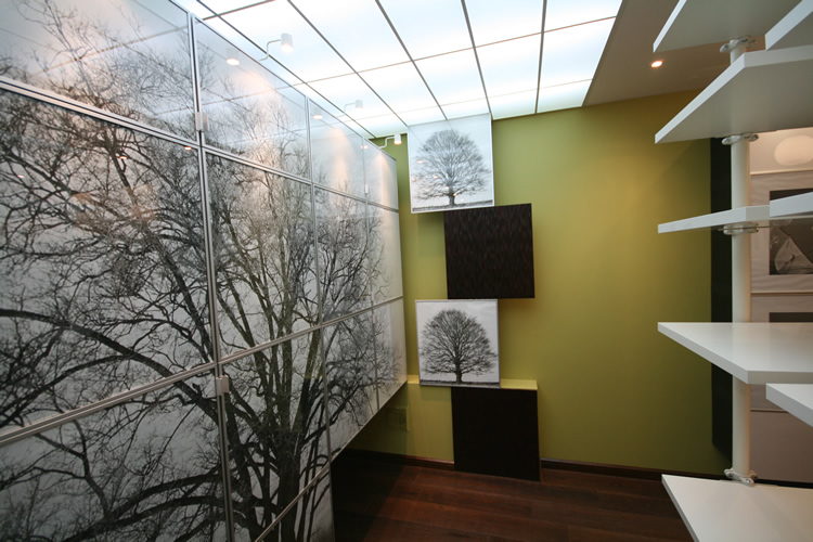 Matt transluzente Produkte sind besonders beliebt bei hinterleuchteten Installationen. Transparenter Effekt in Kombination und weiches Licht geben dem Raum Leichtigkeit, Leichtigkeit und Tiefe.