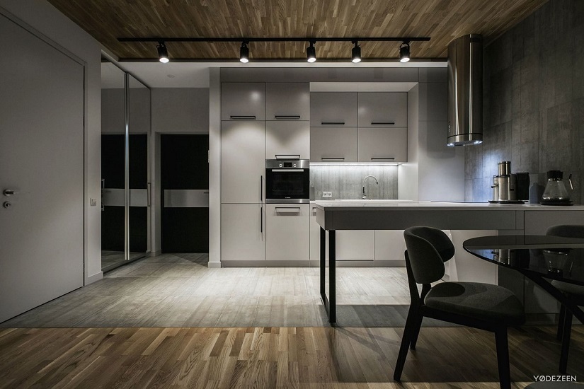 Moderne Stilistik schlagen Sie Optionen für die Verwendung von Highlights vor. Minimalismus ergänzen die Dot-Geräte der richtigen Form mit minimaler Dekor- oder Konturbeleuchtung in Weiß und Gelb.