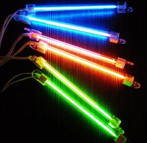 Neonröhre - Die zweite Art von flexibler Lampe. Die Glashohlräume sind mit Leuchtgas gefüllt. Es ist möglich, die Helligkeit des Glühens zu ändern. Systeme erfordern normalerweise einen beträchtlichen Energieverbrauch. Zerbrechliches Glas und unwirtschaftlich machen sie unpopuläre Art der Deckendekoration.