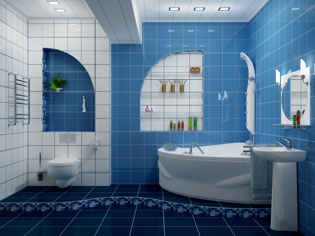 die Badezimmer Es ist besser, die Spiegelzone mit zusätzlichem Licht zu markieren. Dies können Punktvorrichtungen auf der Oberseite oder ein Band sein, das entlang der Umrisse einer Spiegelfläche mit weißem oder bläulichem Licht gestreckt wird, so dass es bequem ist, sich um sich selbst zu kümmern.