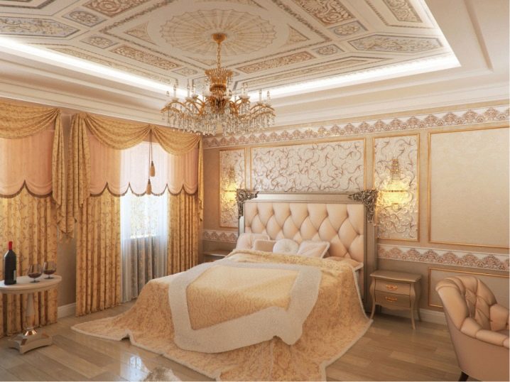 Die geschnitzte Decke mit Stuck im Barockstil unterstreicht die konturversteckte Beleuchtung. Sie wird alle Biegungen und Muster der reichen Dekoration hervorheben, und die goldenen Farben in der Dekoration werden auf eine neue Art und Weise spielen. Klassisches Design liebt eine Fülle von Licht.