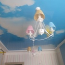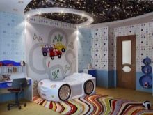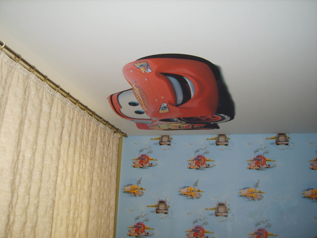 Für ältere Kinder können Sie gestreckte Leinwand mit abstrakten Zeichnungen, geometrischen Linien verwenden. Gymnasiasten bevorzugen ein strenges, aber lakonisches Interieur, weshalb sie meist monochrome Deckenvarianten wählen. Es wird umweltfreundlicher sein, die Deckenschindel anzuordnen. Natürlich können Sie nur interessante Tapeten an der Decke pokleiten, aber diese Methode kann nicht als praktisch bezeichnet werden. Es ist besser, modernere und langlebigere Optionen zu wählen.