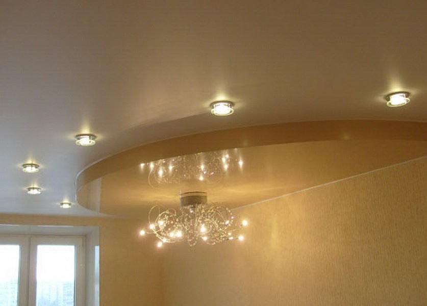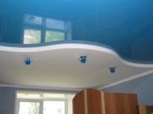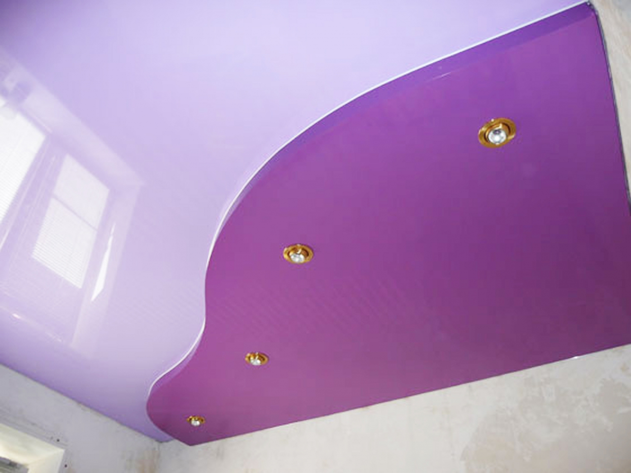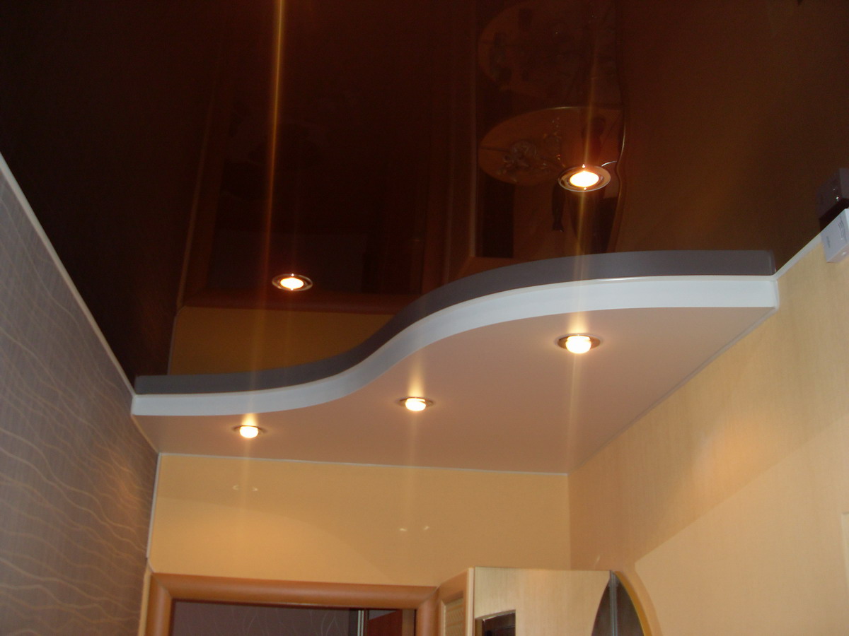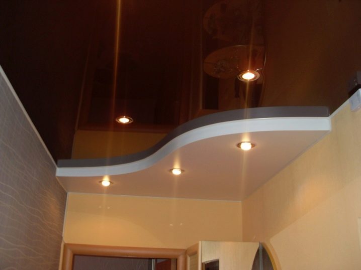 Nicht weniger originelle Look Multilevel-Decken, ein "Boden", der aus glänzendem Canvas gemacht wird, und der andere - aus Matt. So können Sie den Raum trennen, indem Sie ihn in eine dunkle und hellere Zone aufteilen.