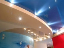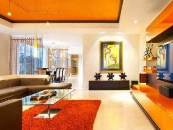 Eine angenehme Atmosphäre im Innenraum wird nur durch eine harmonische Kombination von warmen und kalten Farben erreicht. Aus diesem Grund werden mehrstufige Decken oft in verschiedenen Farben gestrichen, zum Beispiel Rot mit Blau, Orange mit Braun.