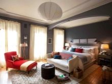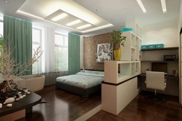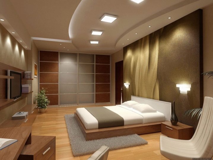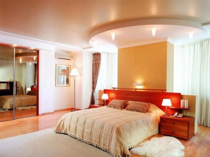 Wie oben erwähnt, erfüllt die Decke manchmal nicht nur dekorative Funktionen, sondern zoniert auch den Raum. Experten empfehlen nicht, den Raum in mehr als drei Zonen aufzuteilen.auch wenn die Schlafzimmergrößen sehr groß sind. Beim Bau einer abgehängten Decke sollten sich ihre Formen mit den von ihnen akzentuierten Möbelformen überschneiden.