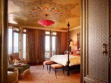 In früheren Zeiten wurden die Decken oft in der Art von Gemälden gemalt, sie konnten auch auf Szenen oder Muster angewendet werden. Das heutige Schlafzimmer ist stilvoll Barock oder Rokoko Sie können mit Deckenmalerei oder Fotodruck dekorieren. Es werden gut abgehängte Decken mit einem Muster, floralen Motiven, Originalzeichnungen aussehen.