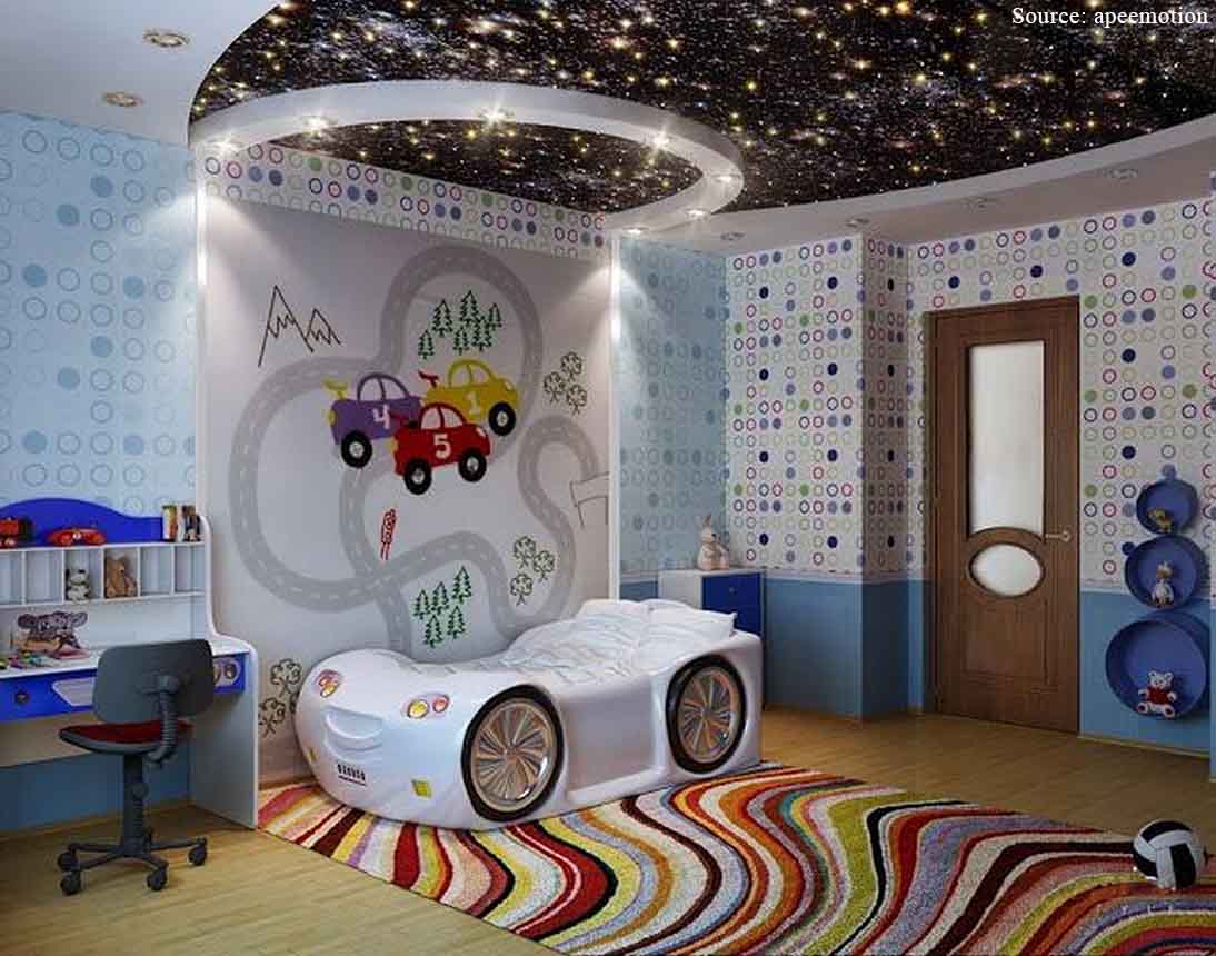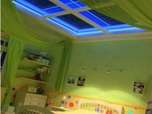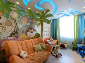 Für Kinder im Vorschulalter wird das beste Design für die Decke Tapeten mit Bildern von Lieblingsfiguren, Tieren, Planeten und geographischen Karten sein. Sehr oft ist die Decke in der Gärtnerei mit einem Muster des Sternenhimmels geschmückt, und Malsterne mit fluoreszierender Farbe geben dem Kind eine wahre Magie.