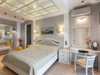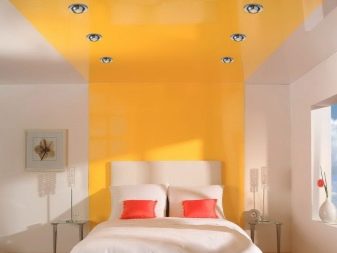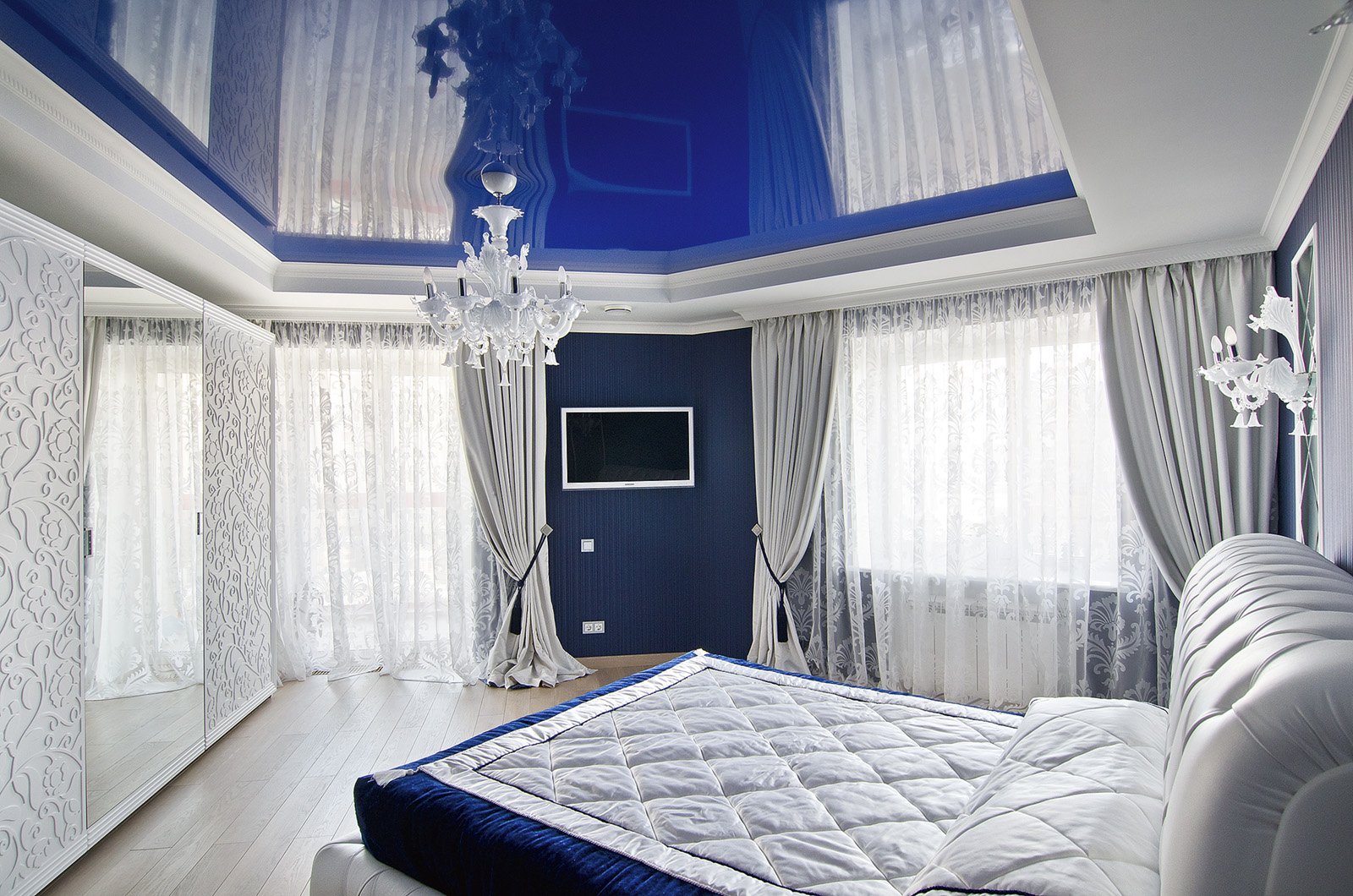 Vergessen Sie nicht, dass das gesamte Design des Raumes harmonisch sein sollte. Durch die Farben der Decke denken, Es ist wichtig, die Größe des Raumes zu berücksichtigen: Für ein kleines Schlafzimmer mit hohen Decken ist es besser, ein mattes Finish zu wählen, es ist auch besser, auf dunkle Farben und stark ausgeprägte Texturen zu verzichten.
