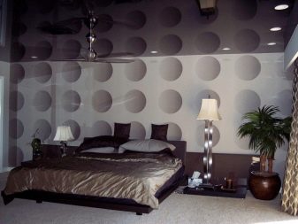 In den Schlafzimmern mit Stil High-Tech Am vorteilhaftesten ist es, Spannstrukturen zu bevorzugen oder abgehängte Decken einzubauen. In jedem Fall sind mehrstufige Konstruktionen mit unterschiedlichem Volumen und unterschiedlicher Form geeignet. Das Beste in einem solchen Raum ist, die Decke nicht mit geraden Linien, sondern mit Wellenlinien zu gestalten, von denen jede mit originalen Lampen dekoriert werden kann. Spiegel an den Wänden ergänzen die Raumwirkung und vergrößern das Schlafzimmer optisch.