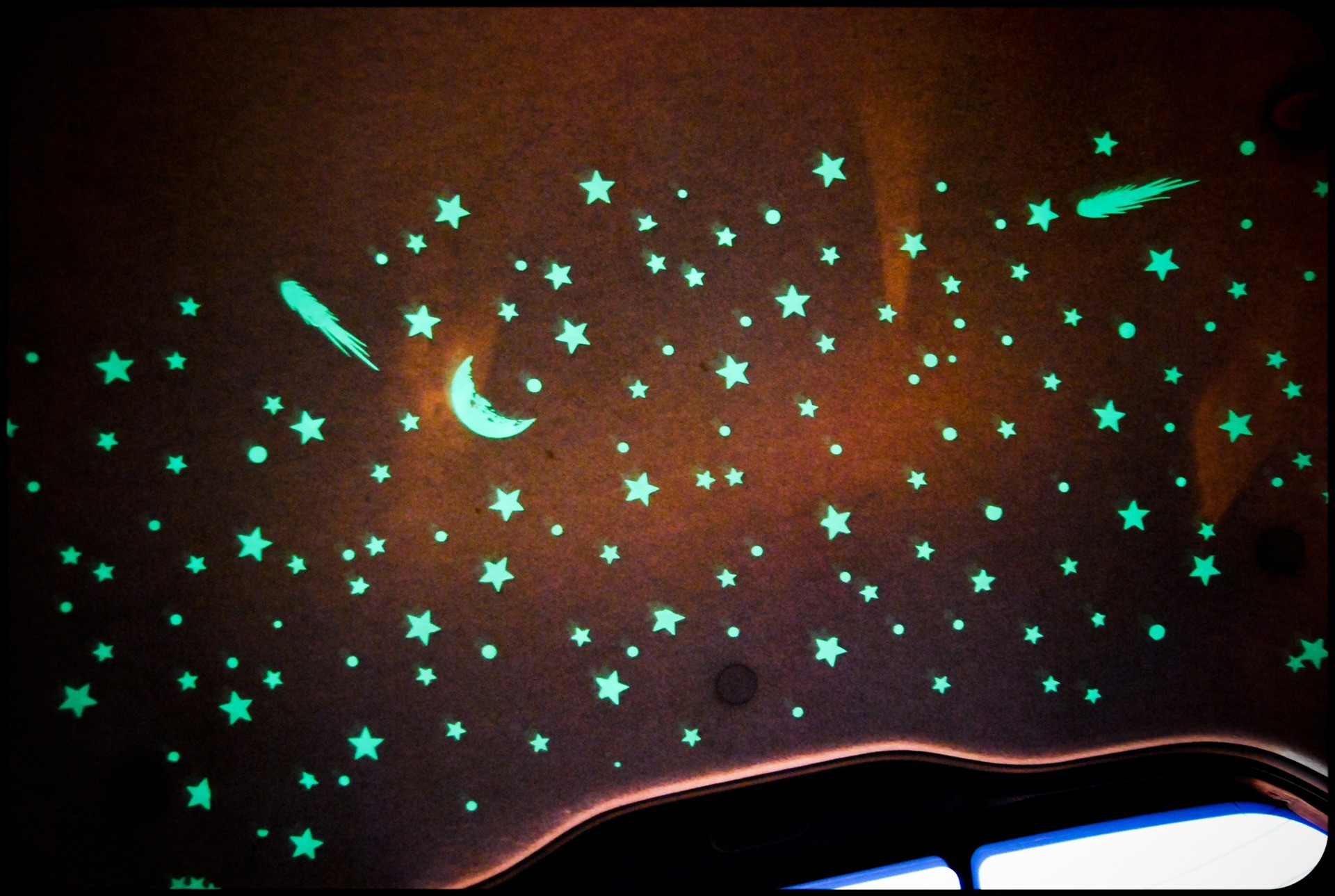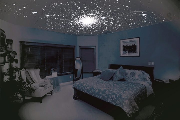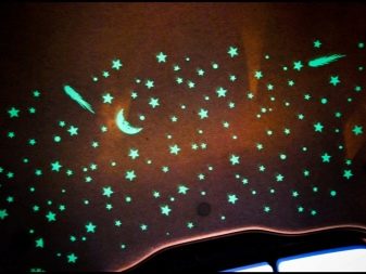 Eine Alternative zu Kronleuchtern können fluoreszierende Farbe oder Aufkleber für die Decke sein, die während des Tages Energie ansammeln und nachts glühen. Einige Hersteller produzieren sogar abgehängte Decken mit phosphoreszierendem Ornament, Silberfäden und versteckter Beleuchtung. Welche Option für das Schlafzimmer zu wählen - Sie entscheiden.